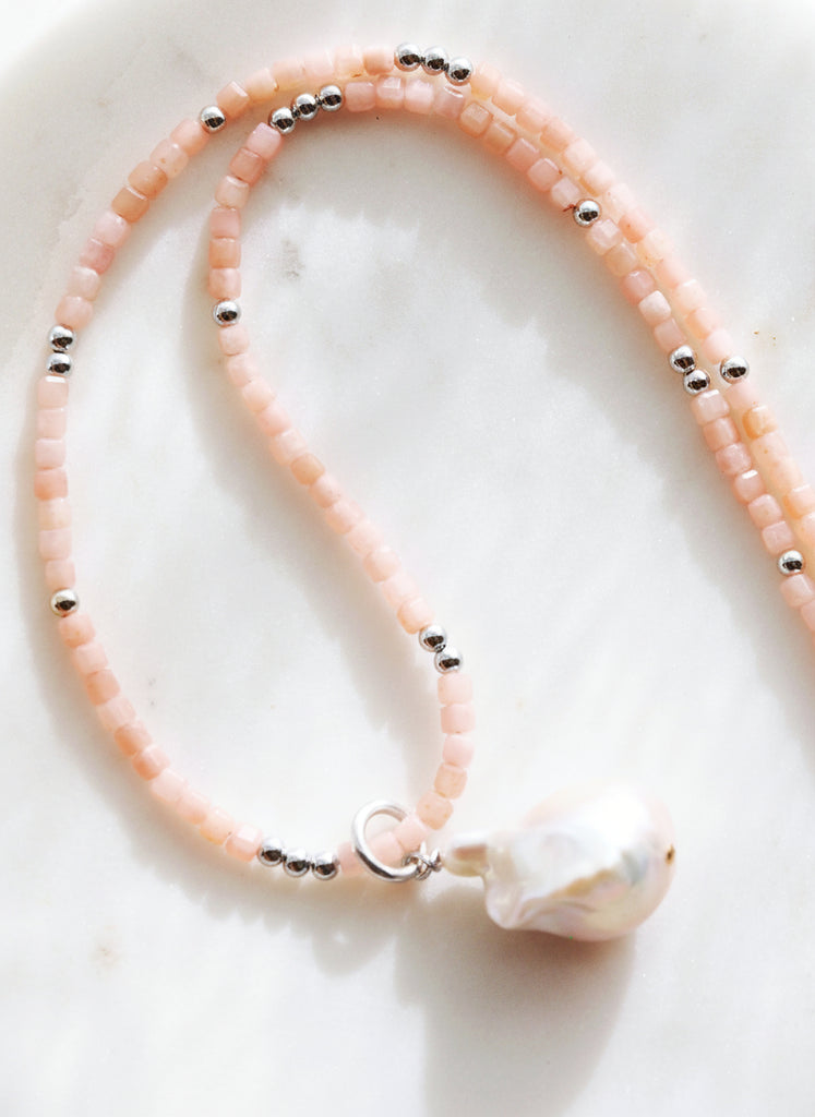 Experience pure luxury with our stunning gemstone necklace, adorned with a beautiful flameball baroque pearl. Elevated with sparkling gemstones and delicate silver beads, this necklace captures the essence of refined paradise.