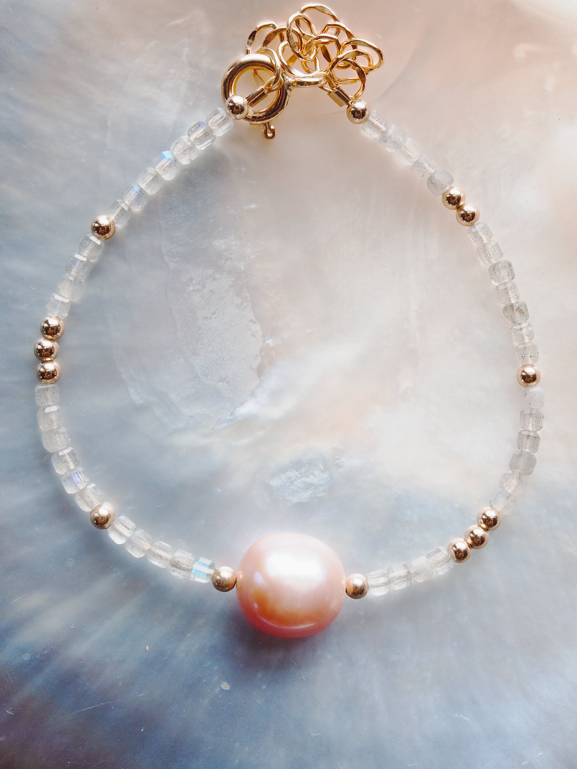 Immerse yourself in luxury with our exquisite gemstone bracelet, featuring a lustrous pink freshwater pearl. Embellished with dazzling gemstones and delicate gold beads, each bracelet evokes a sense of elegant paradise.